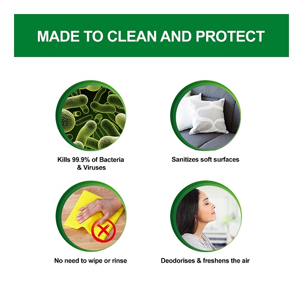 Kills viruses, bacteria, mold and mildrew on surfaces. Eliminates odour causing germs.