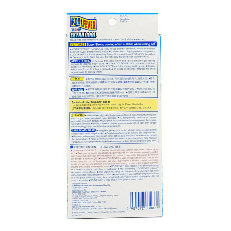 One sheet’s size perfectly fits adults’ foreheads. Use Koolfever once, for efficacy and hygiene. After unpacking, Koolfever gradually decreases cooling effects. After unpacking, tightly fold the notch twice along the dotted line and store in a box to avoid decreasing cooling effects. Avoid storing in places of high temperature, store in a cold place preferably. Content in sheet: Gel (moisture contained in the gel absorbs and releases heat).